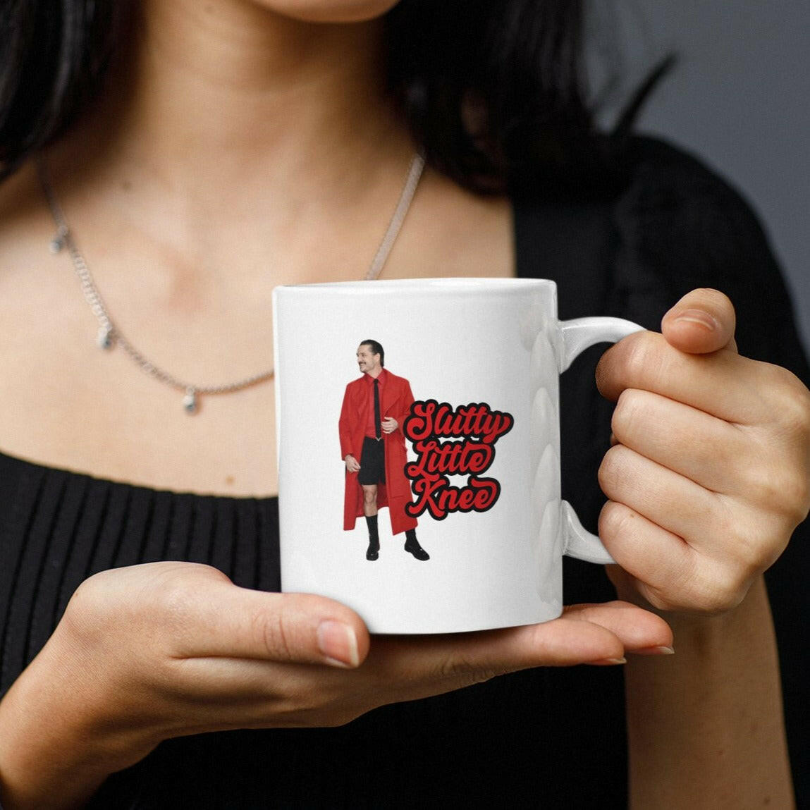 This official Slutty Little Knee mug is the perfect way to show your love for Pedro Pascal! This mug features a colourful design from the star's Met Gala appearance. It's made from durable ceramic material, ensuring that your drinks stay hot and taste great. A great gift for any Pedro Pascal fan!